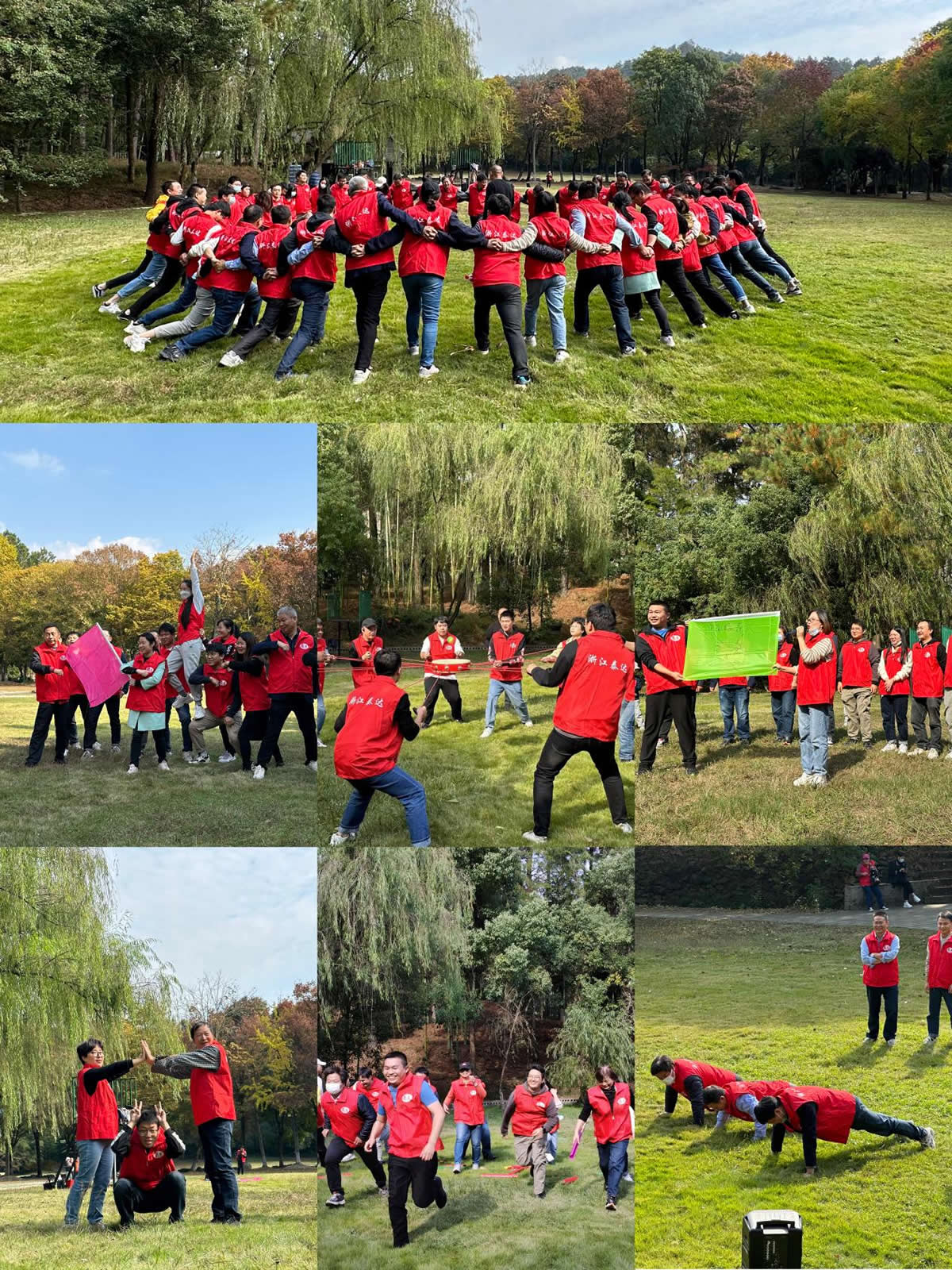 斑斕秋意正濃,微風(fēng)送爽稍涼!首先我們?cè)谥心习俨菰M織了團(tuán)隊(duì)建設(shè)活動(dòng),經(jīng)過(guò)松鼠搭窩、知恩圖報(bào)等熱身活動(dòng)后,全體員工通過(guò)報(bào)數(shù)被分為四個(gè)戰(zhàn)隊(duì),然后創(chuàng)建隊(duì)名、繪制隊(duì)徽和戰(zhàn)斗口號(hào),并通過(guò)全隊(duì)協(xié)作完成不倒森林、細(xì)水長(zhǎng)流、同心奮擊等節(jié)目,在嘹亮口號(hào)和歡聲笑語(yǔ)的喧鬧中,體現(xiàn)了公司員工間濃濃的同事情誼和攜手共進(jìn)的泰達(dá)精神!